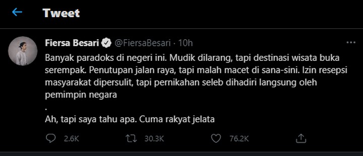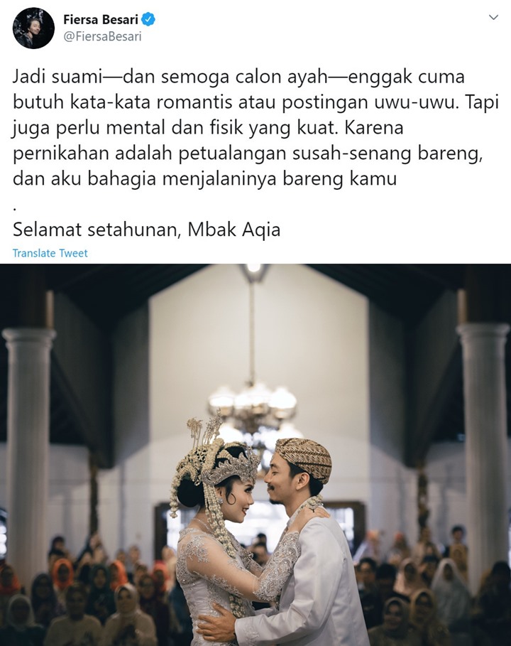 Hasil BRI Liga 1. Seorang Fiersa Besari telah menikah pada 14 Juli 2019 dengan perempuan yang dicintainya selama bertahun-tahun bernama Aqia Nurfadla. Kata-kata dari lagu buku bahkan cuitannya di Twitter banyak dijadikan kutipan romantis.